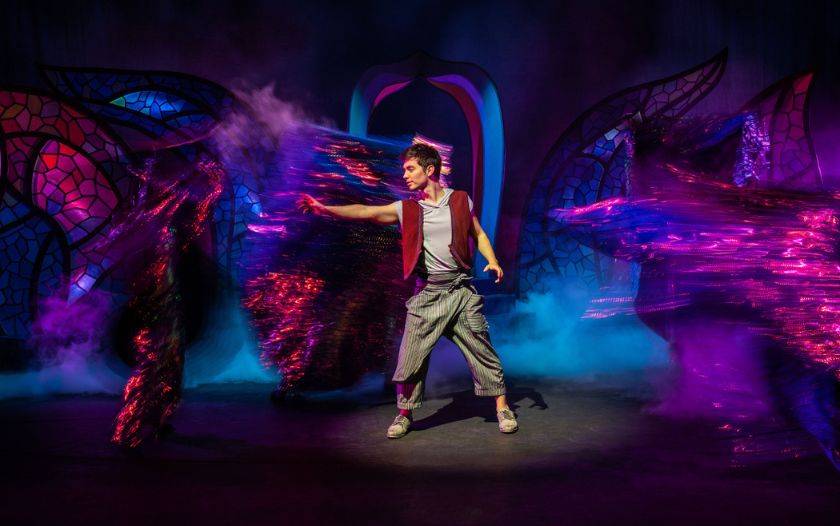 Aladin steht mit ausgestrecktem Arm inmitten von leuchtenden, dynamischen Lichtfiguren.