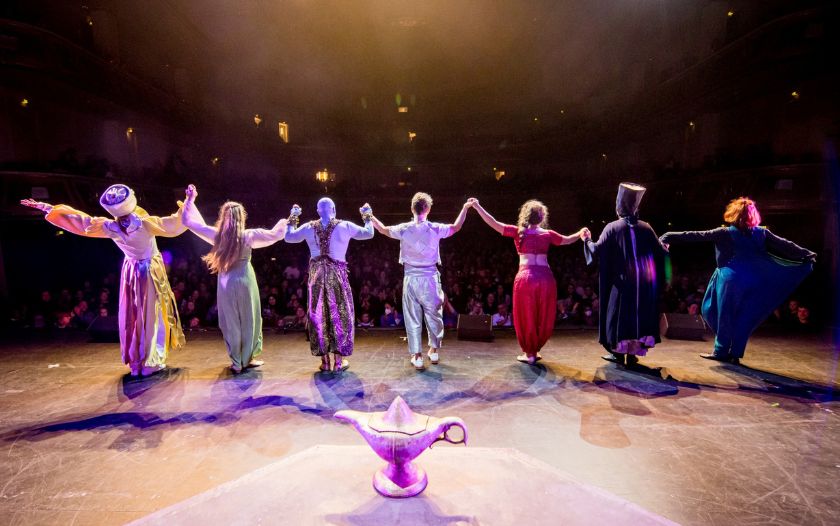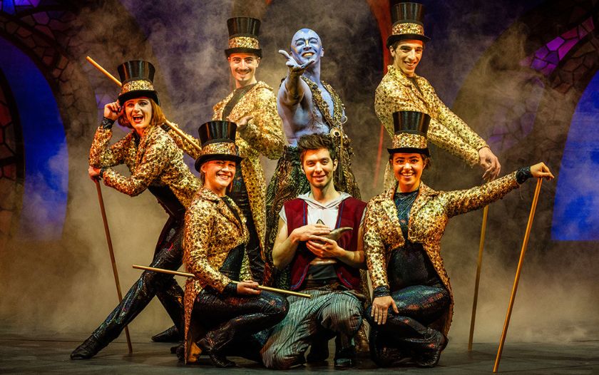 Dschinni, umringt von Tänzerinnen mit Zylindern, steht hinter Aladin, der die Wunderlampe hält.
