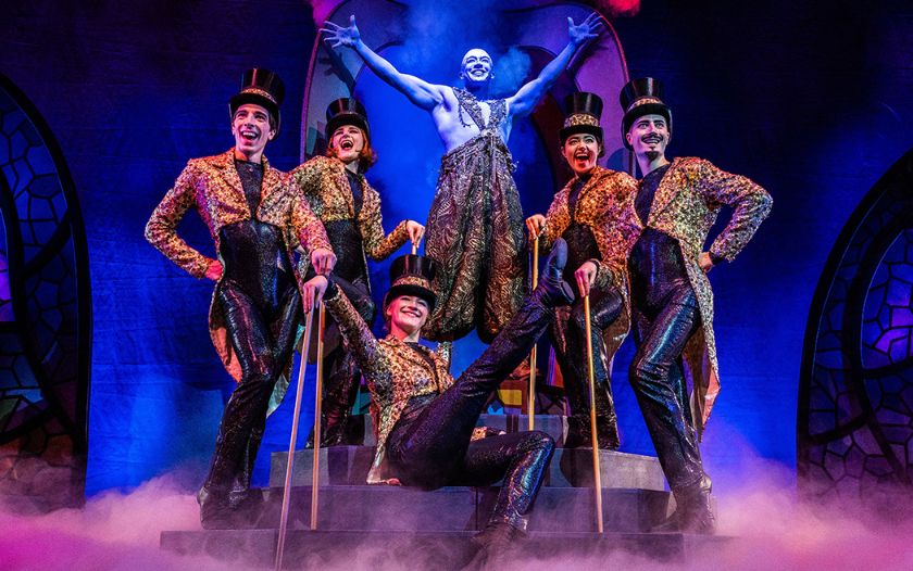 Der blaue Lampengeist steht triumphierend in der Mitte, umgeben von Tänzerinnen in Glitzerkostümen und Zylindern.