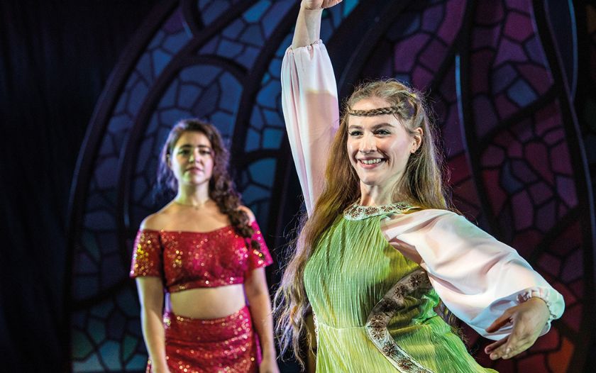 Eine Darstellerin in grünem Kleid tanzt freudestrahlend, im Hintergrund steht eine weitere Darstellerin in rotem Kostüm.