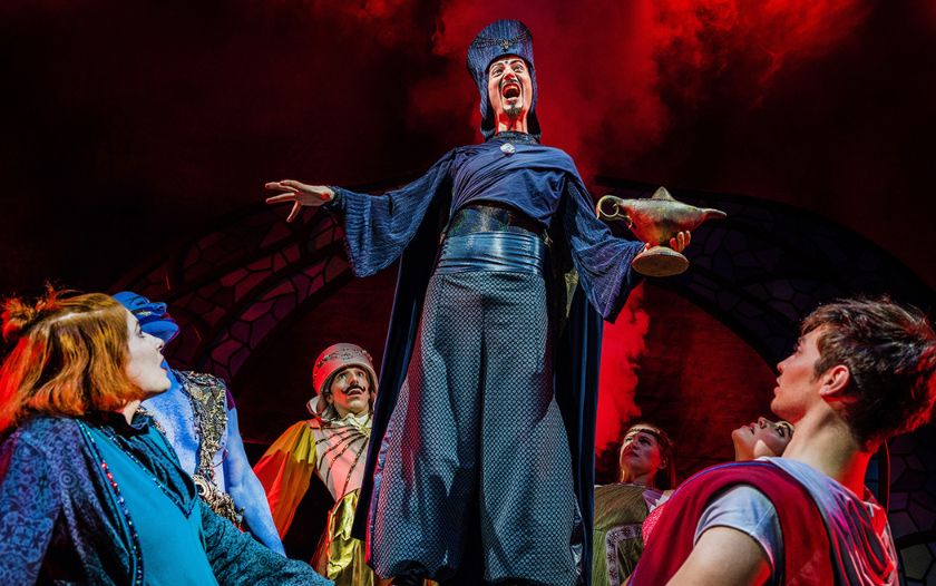 Der Zauberer Dschafar hält triumphierend die Lampe in die Höhe, während andere Darsteller erschrocken blicken.