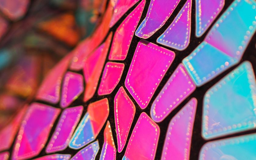 Nahaufnahme von bunten, irisierenden Flächen der Kostüme mit geometrischem Muster.