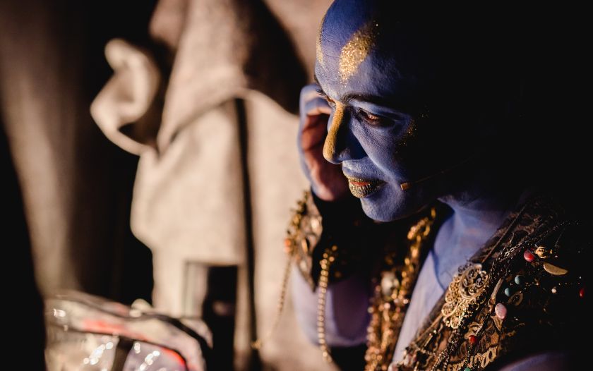 Der Darsteller des Dschinni bereitet sich im Kostüm und mit goldener Schminke im Gesicht auf seinen Auftritt vor.
