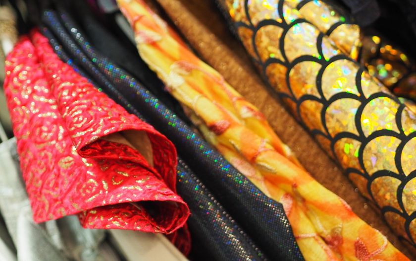 Unterschiedliche Stoffe in kräftigen Farben und Mustern hängen ordentlich nebeneinander.