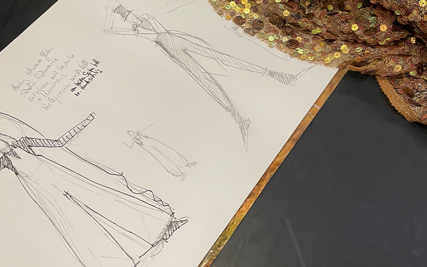 Skizzenblätter mit mehreren Kostümentwürfen und goldenem Paillettengewebe auf dunklem Hintergrund