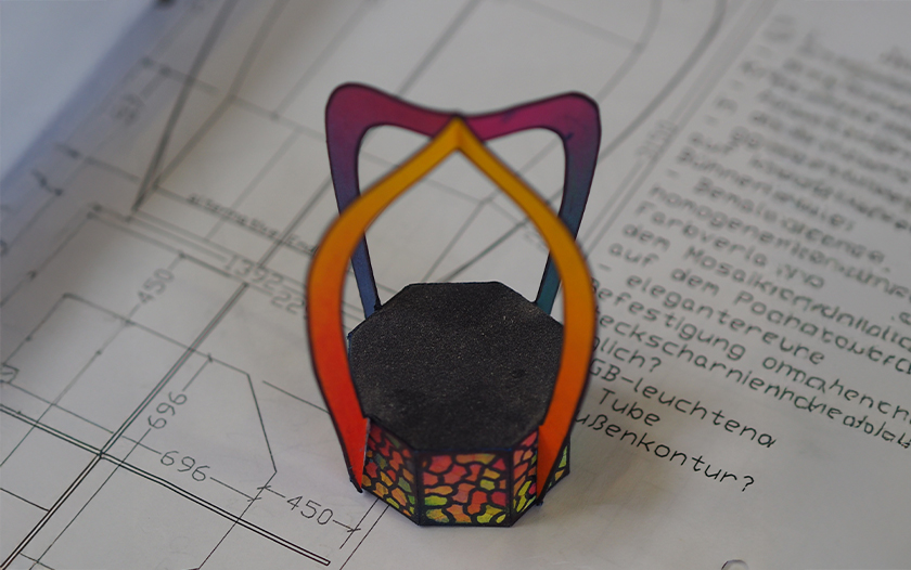 Kleines farbiges Modell eines Bühnenportals auf technischem Plan mit handschriftlichen Notizen