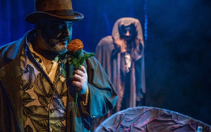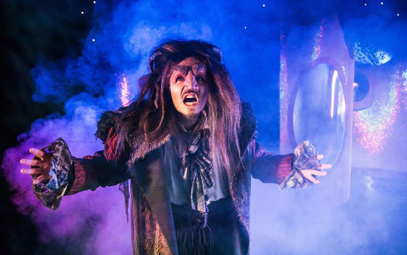 Das Biest schreit wütend auf der Bühne, umgeben von Nebel und Lichteffekten