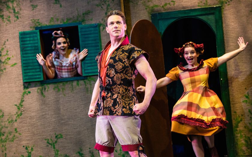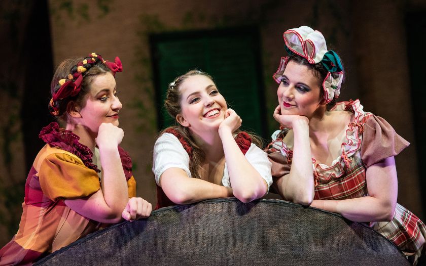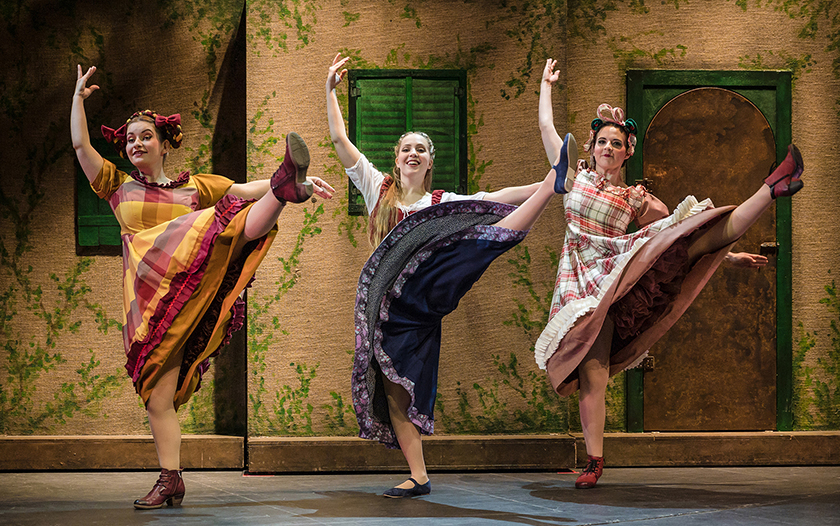Drei Darstellerinnen als Belles Schwestern tanzen synchron in bunten Kleidern vor einem Bühnenbild mit grünen Fensterläden und einer Tür.