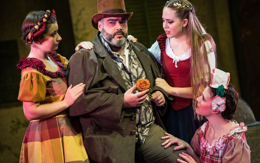 Belles Vater hält mit sorgenvoller Miene die Rose, umgeben von Belle und ihren Schwesternn.