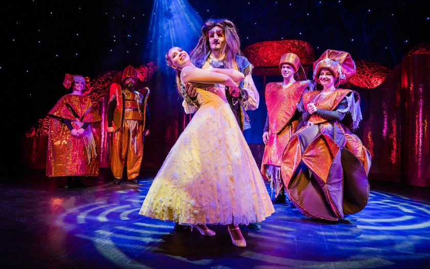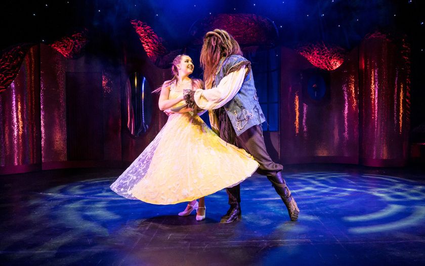 Belle in einem gelben Kleid tanzt mit dem Biest vor den Schlossbewohnern in einer Szene des Musicals „Die Schöne und das Biest“