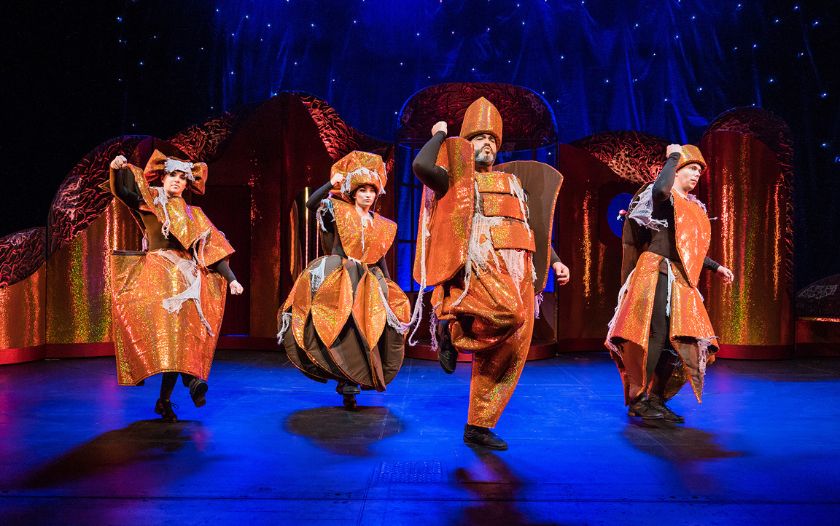 Vier Darsteller als verzauberte Schlossbewohner tanzen in fantasievollen Kostümen auf der Bühne