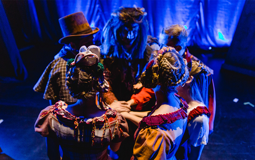 Darstellerinnen und das Biest stehen im Kreis hinter der Bühne, ihre Hände vereint in der Mitte, Bühnenlicht im Hintergrund.