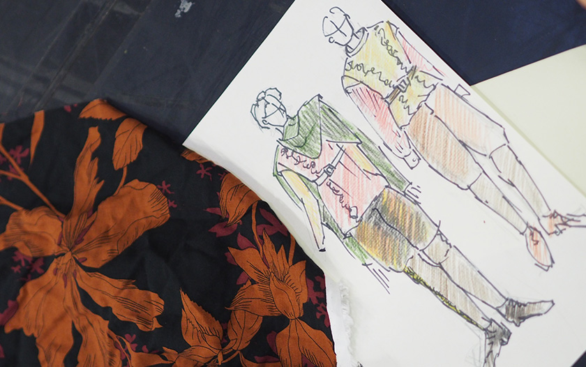 Zwei gezeichnete weibliche Figuren in historischen Kleidern auf einem Skizzenpapier, umgeben von bunten Stoffproben in Karomustern und warmen Farbtönen. Die Entwürfe zeigen fantasievolle Bühnenkleider mit Puffärmeln und verzierten Stoffbahnen.