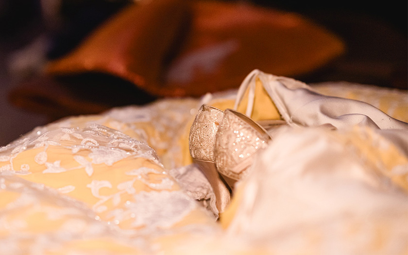 Ein detaillierter Blick auf ein prächtiges Bühnenkostüm von Theater Liberi in sanften Gelb- und Cremetönen mit feinen Spitzenapplikationen. Im Zentrum liegen goldene Glitzerschuhe, eingebettet in die Stofflagen, die auf einen romantischen oder märchenhaften Charakter hindeuten.